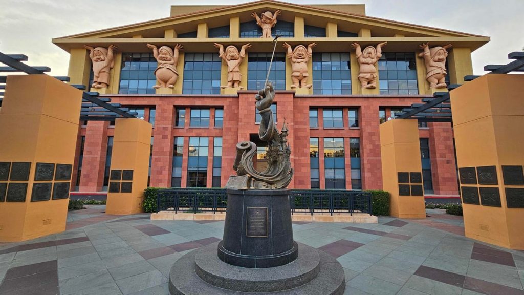 It’s a warm fall afternoon at Walt Disney Studios in Burbank, California, and a gentle breeze blows through the meticulously landscaped trees lining the walkways. On one end of the campus, a ray of sunshine hits the famed Team Disney building, where 19-foot-tall stone carvings of the seven dwarfs (of Snow White fame) hold up the roof.