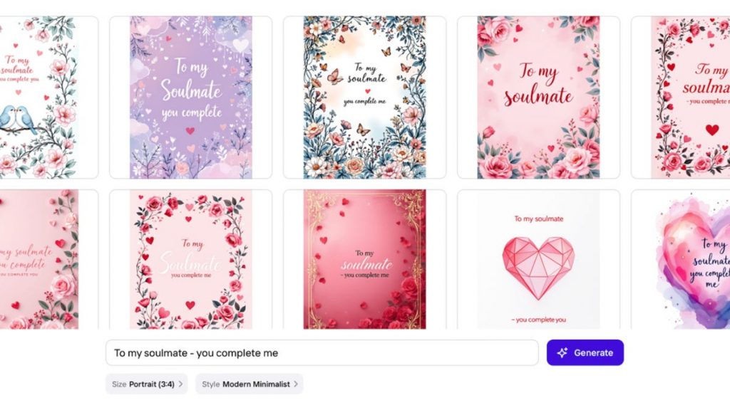 While the prompts are generic and to be expected — like «You make my heart smile» and «you complete me» — I picked one to generate a card, just to see the AI’s «design» capabilities.