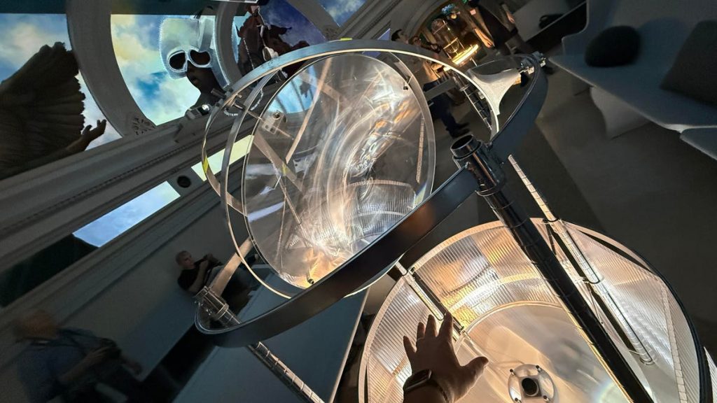 Much like Meow Wolf’s explorations of layers of tech into artist installations, something I talked about at SXSW recently, Ministry of Awe is playing with tiny doses of AI — nothing that generates or replaces the work of artists but rather in a way that highlights and possibly enhances. The Ministry of Awe’s signature fifth-floor artwork, The Heavens, is a giant mural work by Saligman that’s projected across the segments of the ceiling. Angled seats let visitors hang around and gaze up, but several «instruments» in the room let you play with the space, too, created by the tech company Spatial Pixel.